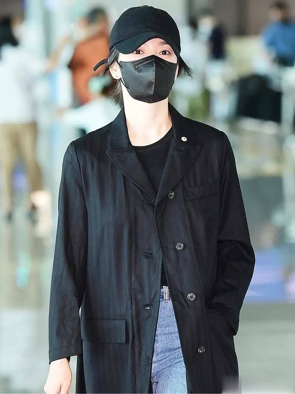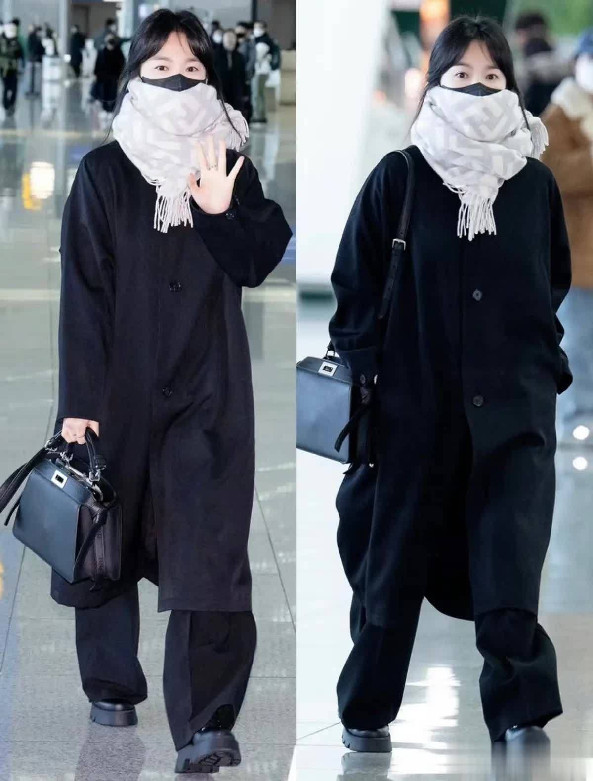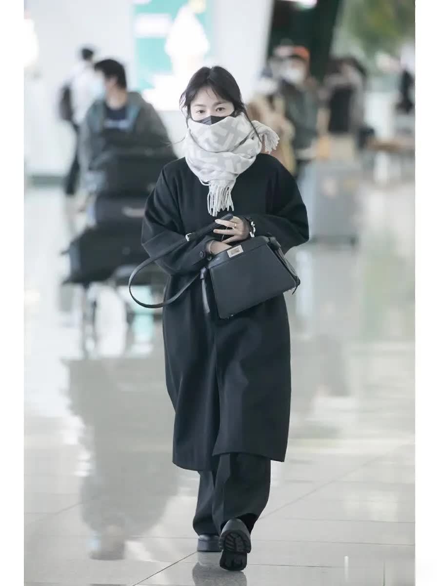 这身黑色系大衣搭配阔腿裤的造型酷飒十足。大衣是宽松的落肩版型,长度过膝,面料垂坠感极佳,没有多余装饰,仅靠利落剪裁勾勒出随性轮廓,就能巧妙遮掩腰腹、臀部的小赘肉,对身材的包容性极强。搭配同色系阔腿裤,裤型宽松不拖沓,纵向拉伸线条,让她161cm的身高穿出了超模比例,走路自带强大气场。
